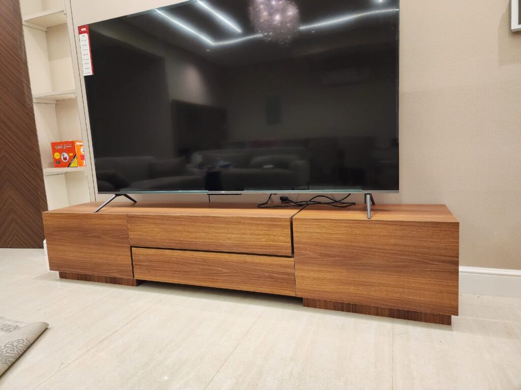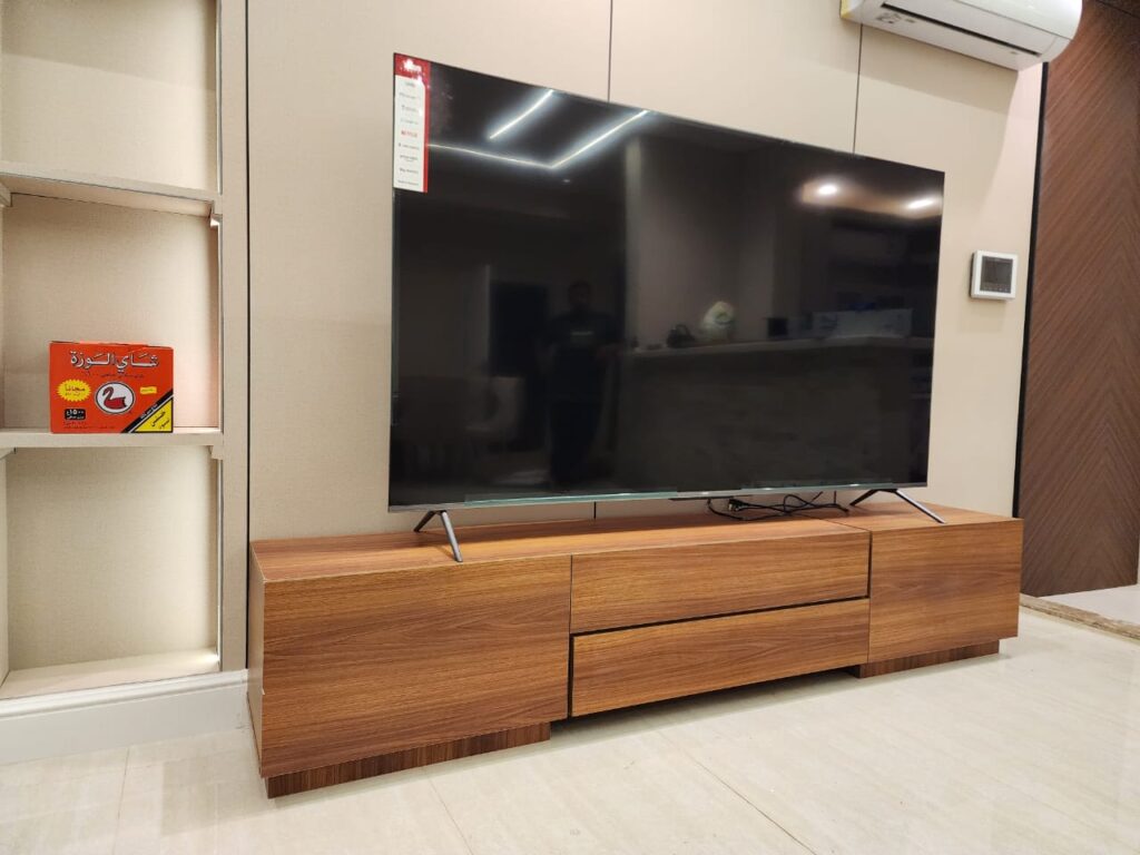 وحدة تلفزيون عملية، مصمّمة لتنظيم منطقة الشاشة وتخزين الأجهزة والإكسسوارات.